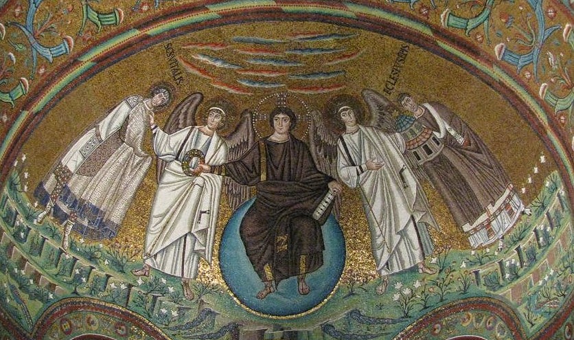 L’hiver dernier j’ai visité l’église San Vitale à Ravenne en Italie. Parmi les mosaïques, Justinien et Théodora se font face, entourés des courtisans et des prêtres. Dans l’abside un Christ imberbe sur une prairie verdoyante, avec des fleurs, des agneaux et des fontaines.
