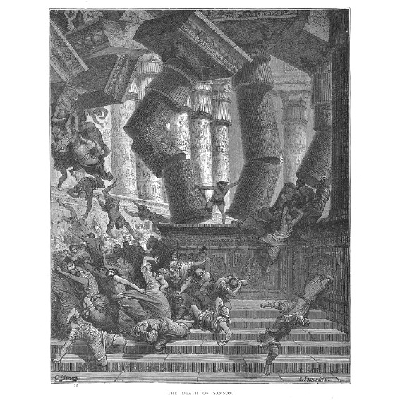 Gustave Doré se plaisait à retrouver dans les scènes bibliques le fantastique auquel il réussissait si bien. Ainsi cette représentation incroyable de Samson ébranlant par ses propres forces les piliers du temple philistin de Dagon.
