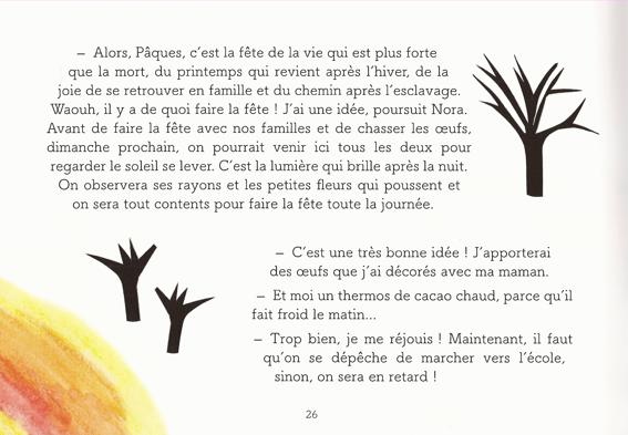 La petite Nora et son ami Paolo partent à la chasse aux œufs et comprennent qu’il s’agit plutôt à Pâques de célébrer la résurrection du Christ en parallèle au renouveau de la nature.